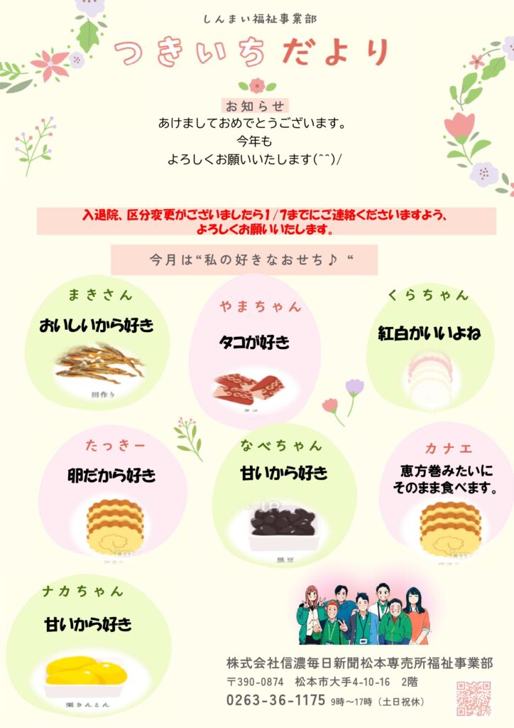 つきいちだよりを発行しました。 2026 1/06 お便り 2026年1月6日 しんまい福祉事業部 つきいちだよりを発行しました。 カナエ 今月はわたしの好きなおせち!! ナカちゃん みなさんは何が好きですか? お便り よかったらシェアしてね! URLをコピーしました! URLをコピーしました! 年末年始休業のお知らせ 関連記事 つきいちだよりを発行しました。 2025年12月1日 つきいちだよりを発行しました。 2025年11月7日 つきいちだよりを発行しました。 2025年10月1日 つきいちだよりを発行しました。 2025年9月4日 つきいちだよりを発行しました。 2025年8月12日 つきいちだよりを発行しました。 2025年7月11日 つきいちだよりを発行しました。 2025年6月20日 つきいちだよりを発行しました。 2025年5月20日