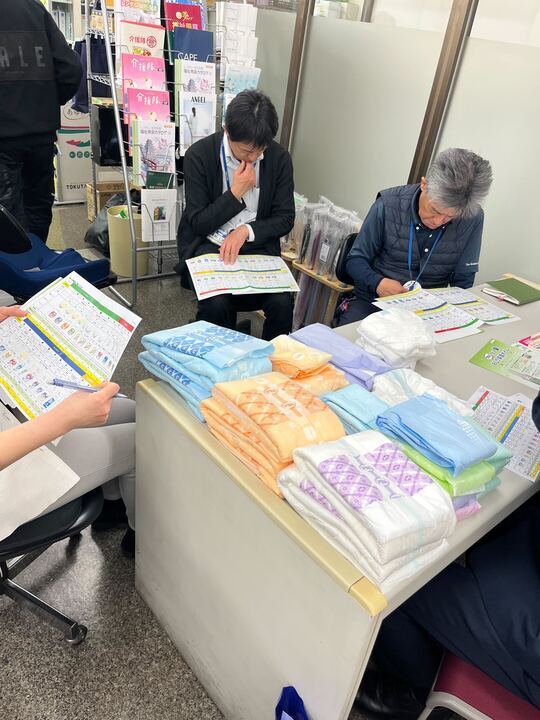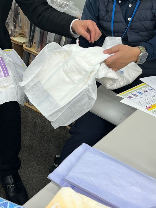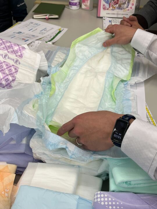 勉強会では、リハビリパンツ・尿とりパッド・テープ止めタイプのおむつの特徴や使い分けについて、実物を見ながらわかりやすく説明していただきました。